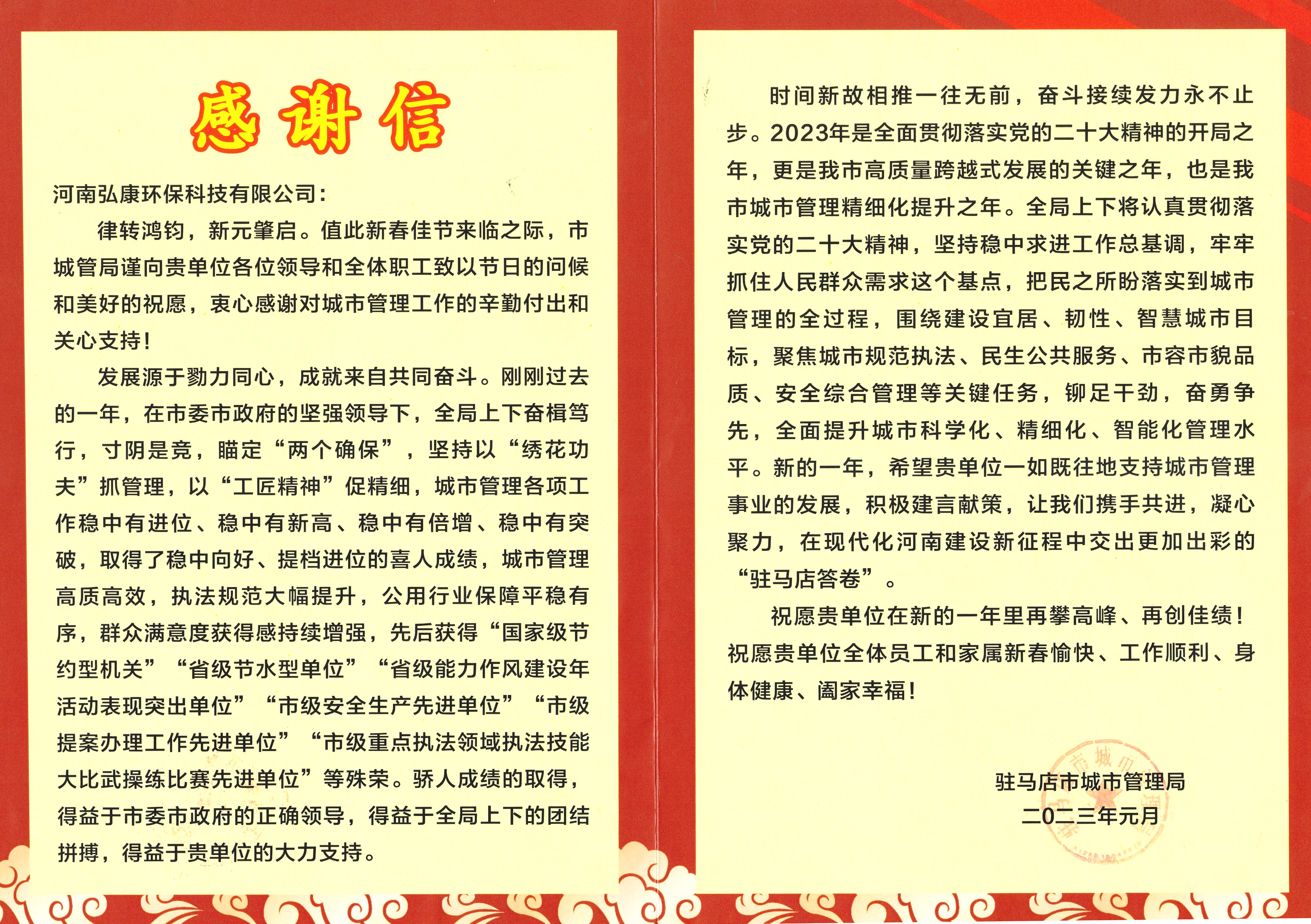 河南弘康環(huán)??萍加邢薰臼盏今v馬店市城市管理局新春感謝信 新春佳節(jié)來臨之際,河南弘康環(huán)??萍加邢薰臼盏今v馬店市城市管理局發(fā)來的感謝信,對過去…